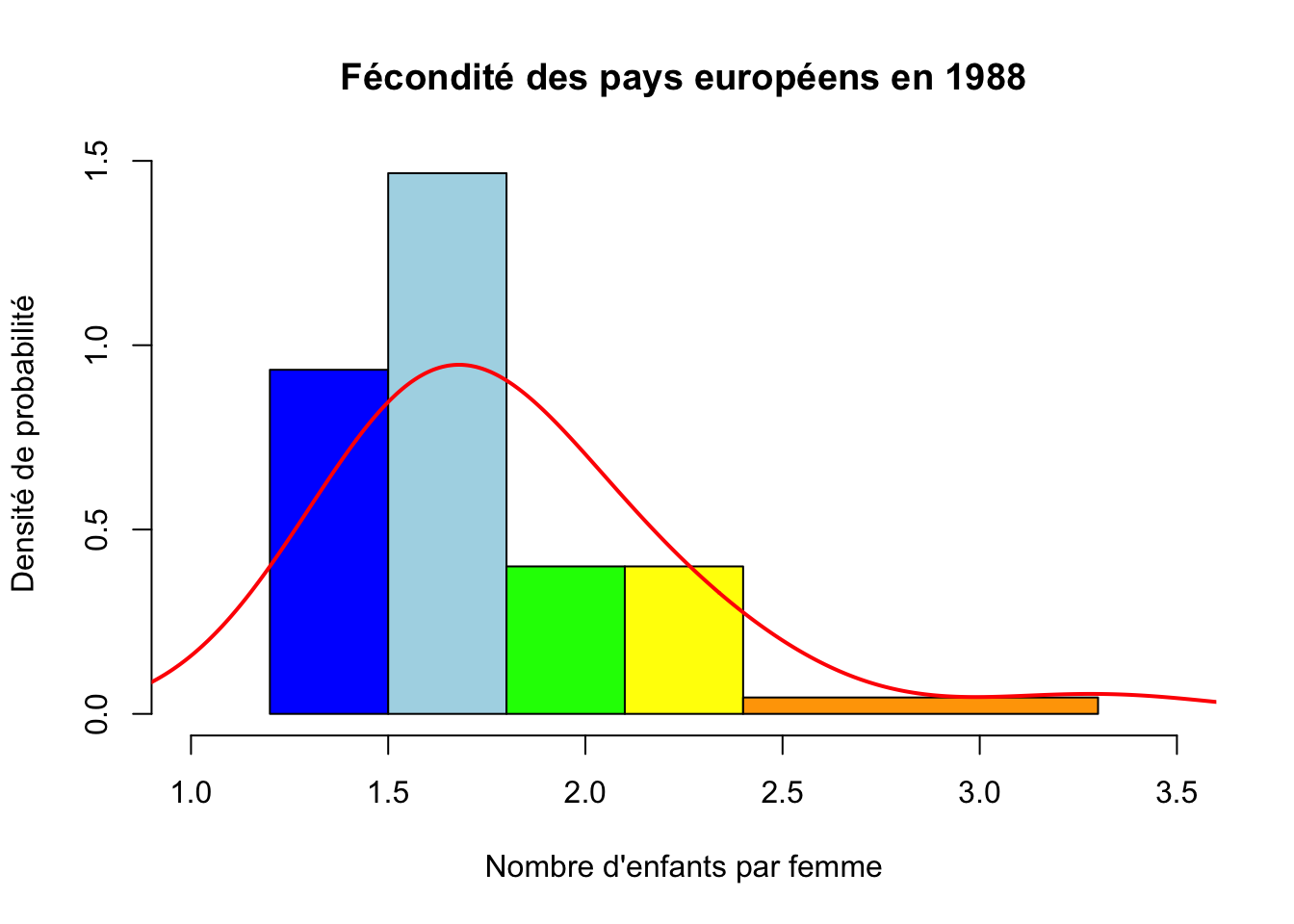 On peut ensuite améliorer avec l’ajout de titres et un choix précis de classes. Dans le cas de la fécondité, il est par exemple important d’utiliser le seuil de 2.1 enfants par femme qui correspond au renouvellement des générations. On remarque que si les classes sont d’amplitudes inégales R utilise la densité de probabilité (rapport entre effectif et amplitude de la classe) et non plus l’effectif ce qui est statistiquement correct (et que ne fait pas Excel …).