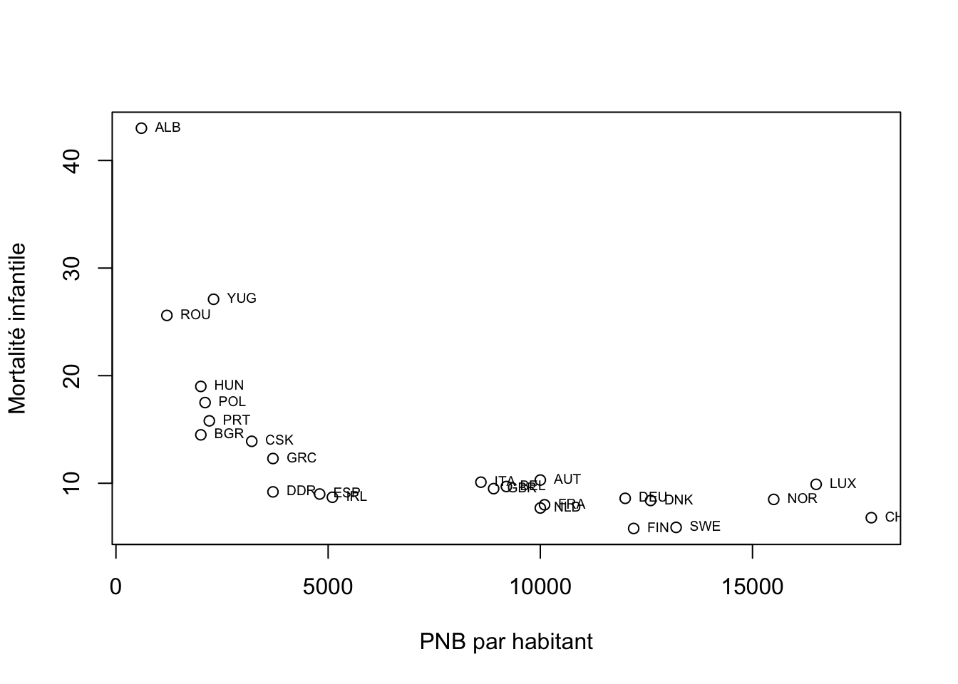 plot(X,Y, xlab="PNB par habitant",ylab="Mortalité infantile")