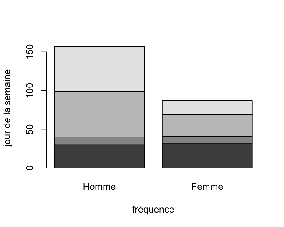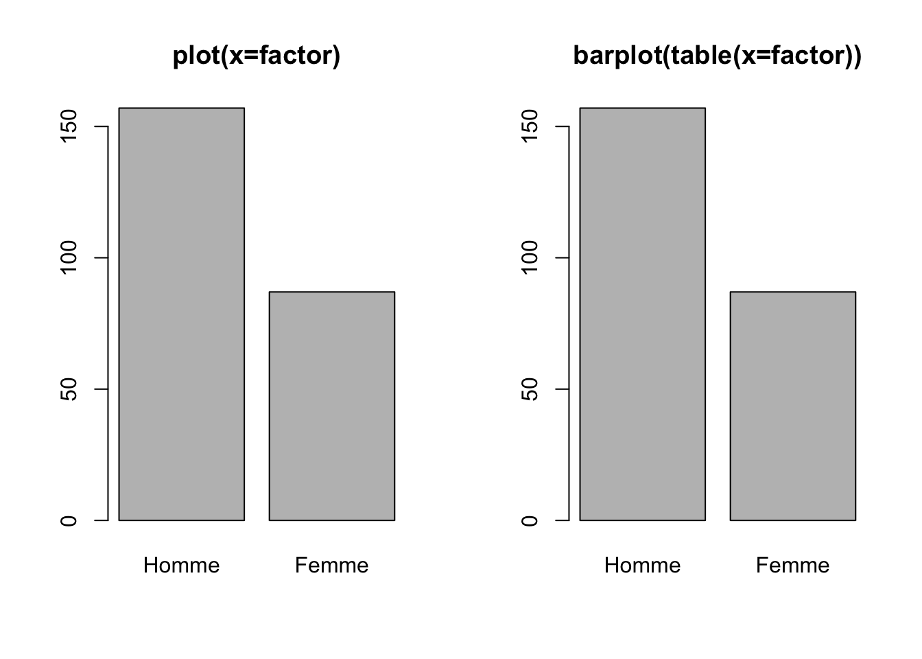 La fonction barplot() permett de créer des diagrammes en barres qui résultent en général du dénombrement d’une ou deux variable qualitative à l’aide des fonctions table() ou xtabs().