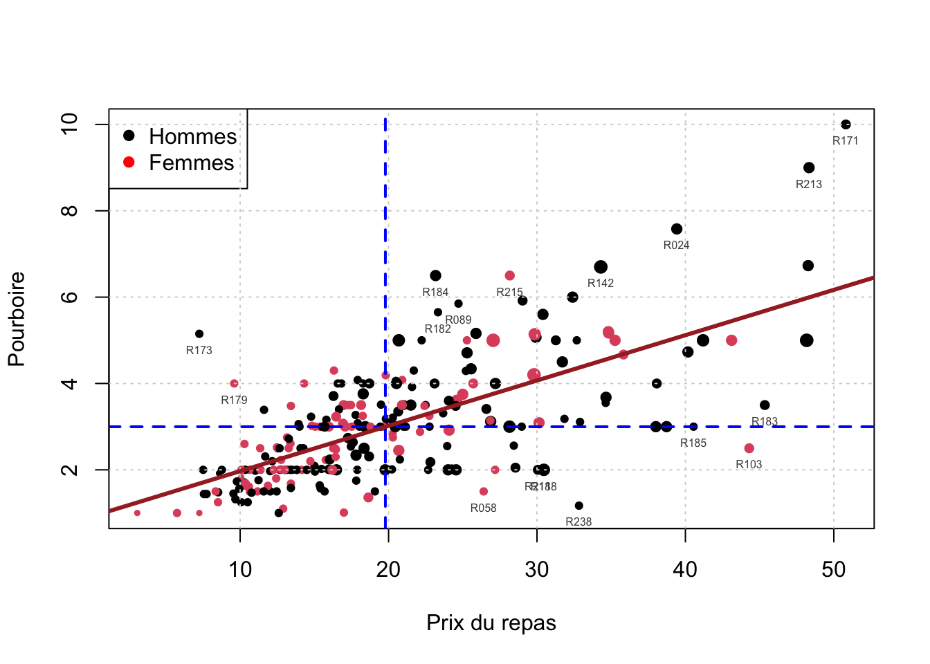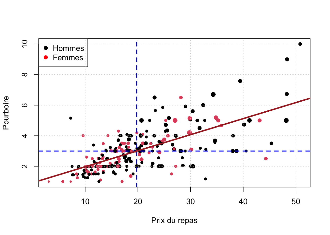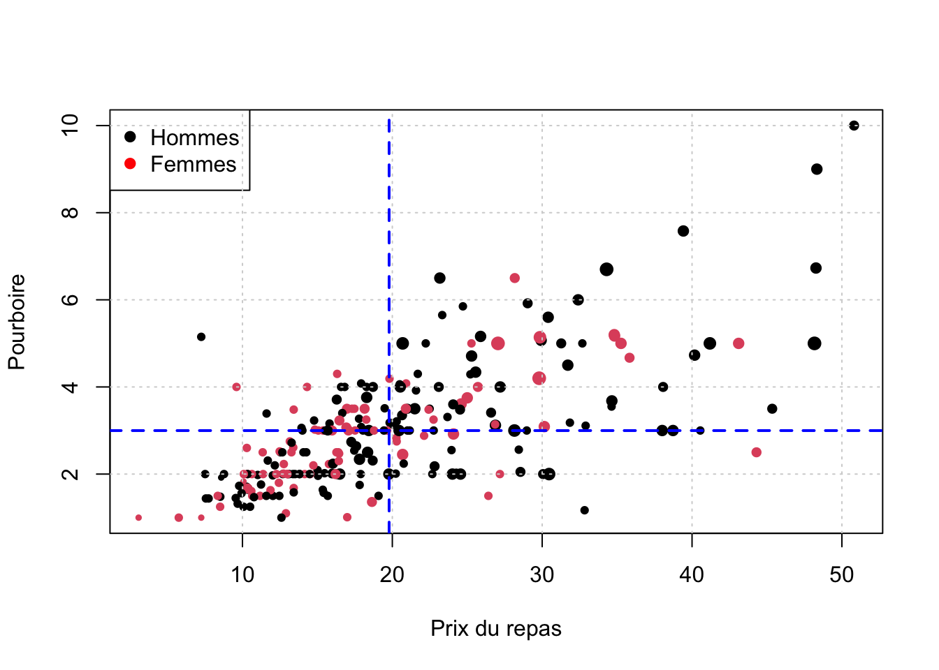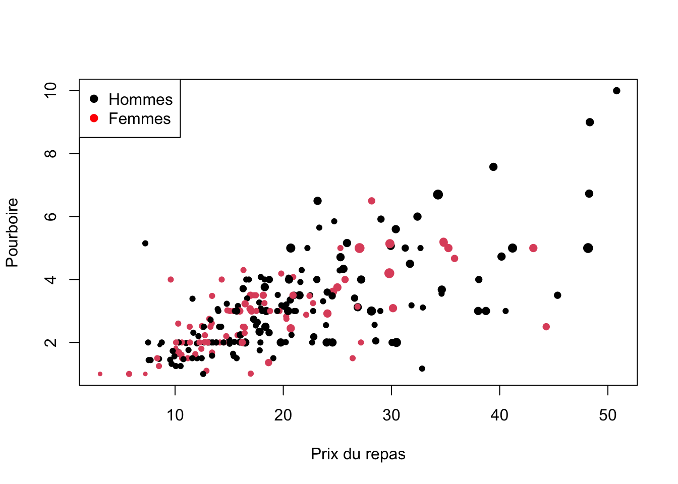 On neutralise l’affichage des points générés par plot() et on les trace avec la fonction points() en précisant leur taille (nombre de repas) et leur couleur (hommes ou femmes) et en ajoutant une légende avec legend()