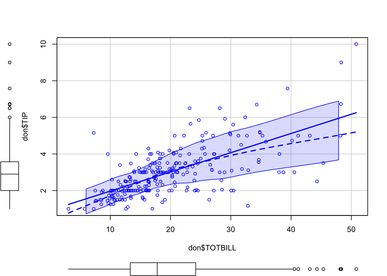 text(don2$TOTBILL,don2$TIP,don2$IDEN,cex = 0.5, pos = 1, col="gray30")
