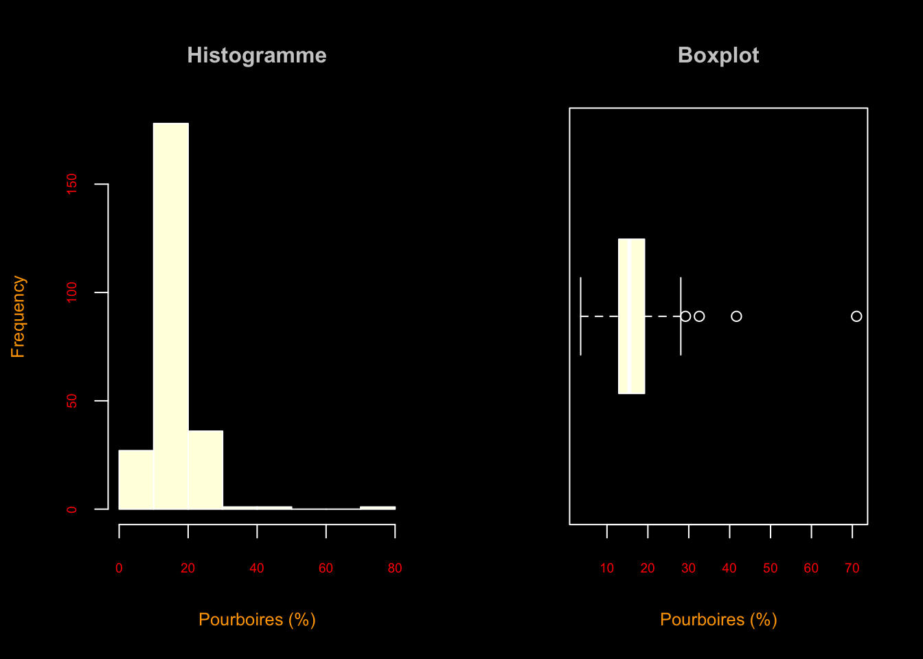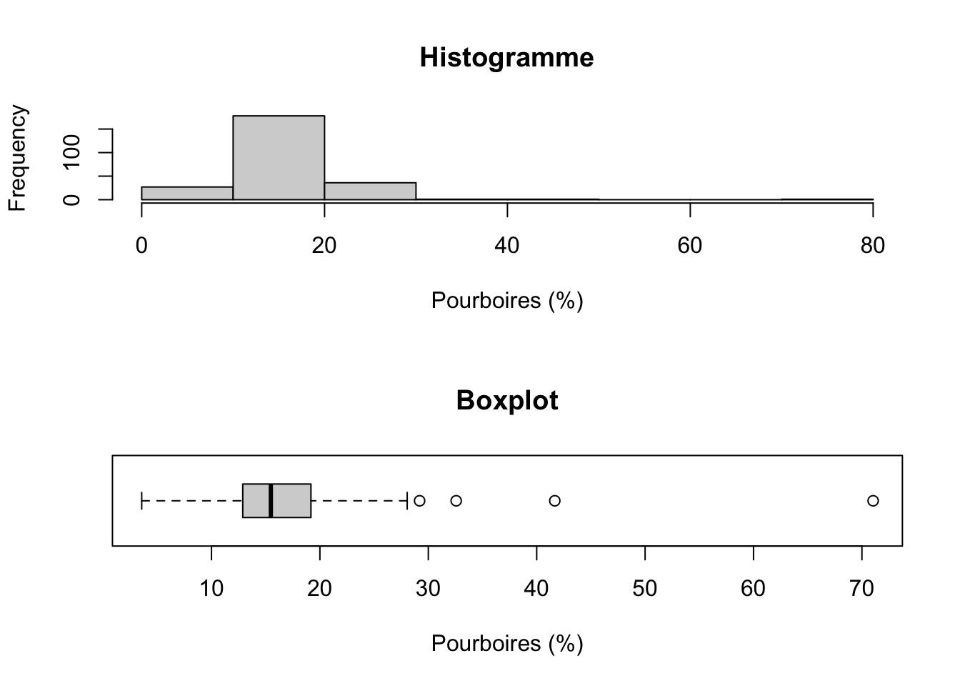 Supposons que l’on veuille disposer verticalement une boxplot et un histogramme de la variable PCT. On va utiliser l’instruction mfrow=c(2,1) pour placerles deux figures suivantes sur des lignes séparées :