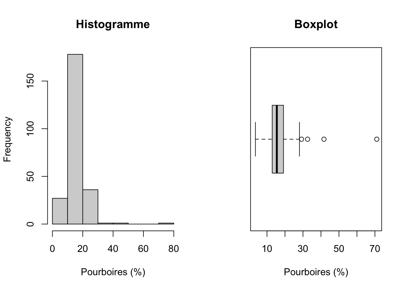 boxplot(don$PCT, horizontal=T, main="Boxplot", xlab = "Pourboires (%)")